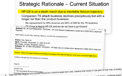 Time and again, Fink, in particular, talks about the imminent “end of life” of Itanium while trying to keep that knowledge from partners like Microsoft, which, like Oracle, made software to run on Itanium. Fink urged HP executives to “avoid any (Itanium) conversations” about the chip’s future and instead “extract money from Microsoft” to accelerate engineering work related to the secret projects.