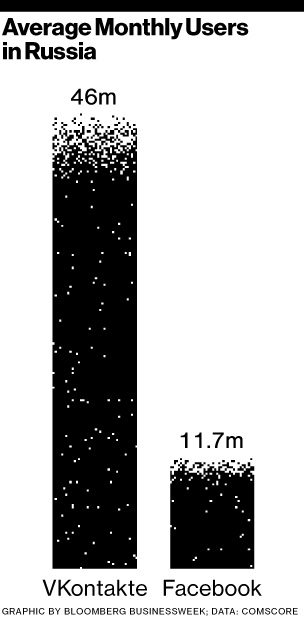 VKontakte owed its early gains to its first-mover advantage on the Russian market. At the time, Facebook was limited to those with American college e-mail addresses. Even more, says Yuri Saprykin, the editor-in-chief of the publishing company Rambler-Afisha, the site was made by “brilliant programmers.” VKontakte’sinterface is arguably more intuitive than Facebook’s; load times, especially on the mobile application, are noticeably faster. It’s also hard to underestimate the appeal of the free, unlicensed music, films, and television shows available on the site. VKontakteusers spend an average of more than eight hours a month watching videos on the site, making it one of the largest copyright violators in Russia, if not the world. According to ComScore, it has 46 million monthly users, compared with Facebook’s 11.7 million in Russia.