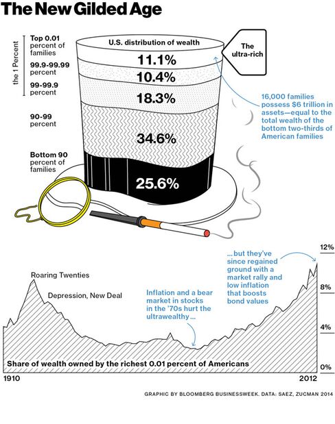 The rallying cry of the Occupy Movement was that the richest 1 percent of Americans is getting richer while the rest of us struggle to get by. That’s not quite right, though. The bottom nine-tenths of the 1 Percent club have about the same slice of the national wealth pie that they had a generation ago. The gains have accrued almost exclusively to the top tenth of 1 Percenters. The richest 0.1 percent of the American population has rebuilt its share of wealth back to where it was in the Roaring Twenties. And the richest 0.01 percent’s share has grown even more rapidly, quadrupling since the eve of the Reagan Revolution.