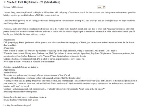 Reads the post: “2 smart, funny, attractive girls each looking for a fall boyfriend with chill group of bro friends, now is the time you must start dating someone in order to spend the holidays together/go on ski trips/have a NYE kiss.”