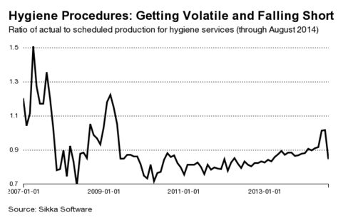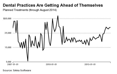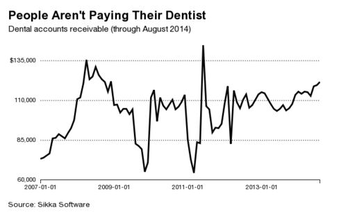 Finally, it comes down to money. And people aren’t paying up. Accounts receivable are now climbing back up to 2008 bubble-bursting levels. It’s up 22 percent compared with 2013. “The steady curve upward shows money is not being collected after treatments are performed,” Sikka says. “It could be because patients or insurance are not paying in time, and over-optimistic treatments are being performed by dentists.”