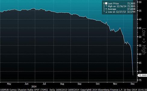 Russia's economy has been hurt by two big things: the falling price of oil and economic sanctions. (Remember Crimea?) The oil and gas industry generates about half of Russia's revenue, so when a combination of the shale boom in the U.S. and weaker demand worldwide pushed the price from $110 per barrel earlier this year to $60, Russia got hammered. The sanctions imposed by Europe and the U.S., designed to punish Russia's companies for President Vladimir Putin's actions in Ukraine, have hurt, too.