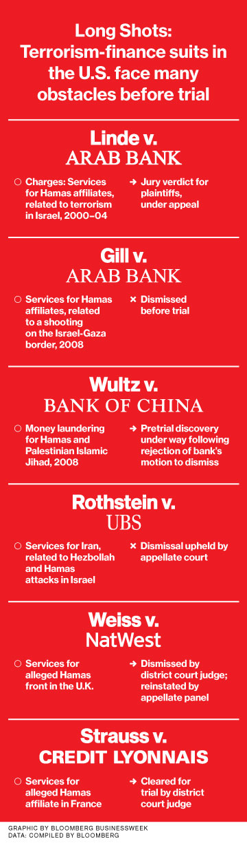 “The plaintiffs’ evidence in this case is a mile wide and an inch deep,” said defense lawyer Shand Stephens in September after losing the Arab Bank trial. Stephens is a partner at 4,200-attorney DLA Piper, the largest law firm in the world. He denies wrongdoing by his client, as do lawyers for HSBC and the other Europe-based banks named in Osen’s suits, and vows to appeal. (Bloomberg Businessweek sought comment from representatives of every bank mentioned in this article; most did not respond.)