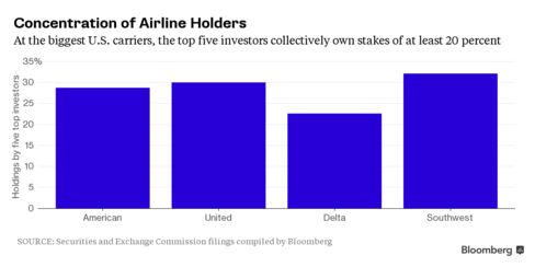 BlackRock Inc. is among the five biggest holders at each of the four largest U.S. airlines, according to data compiled by Bloomberg. State Street Corp., JPMorgan Chase & Co., Primecap and Capital Group Cos., which runs the American Funds group, also fall into that category, with stakes in two or more of the carriers.