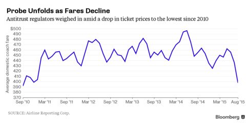 The department’s airline inquiry surprised the industry because ticket prices have been falling this year. With discount carriers including Spirit Airlines Inc. piling on seats, average U.S. domestic coach fares are plunging, reaching the lowest since 2010 last month.