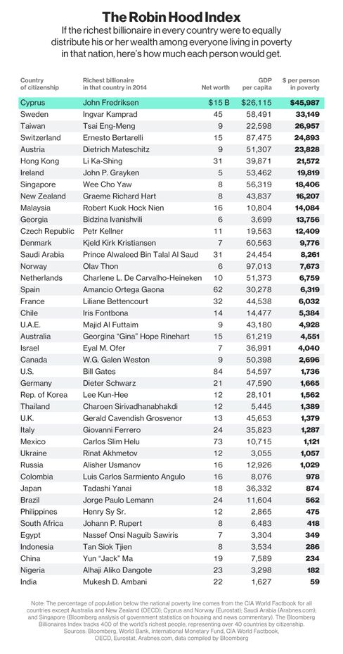 The index shows how the net worth of each country's wealthiest person compares to the livelihood of his fellow countrymen by calculating the lump sum in dollars each person living in poverty would get if the assets of the richest citizen were liquidated and redistributed. The Bloomberg Billionaires Index and the CIA World Factbook were our reference points.