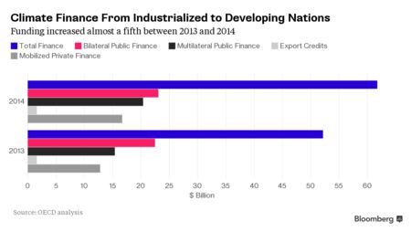 Payments in the form of support from governments and investment from companies rose by almost a fifth since 2013, according to a report on Wednesday from the Organization for Economic Cooperation and Development and the Climate Policy Initiative. About $10 billion a year was flowing in the three years through 2012.