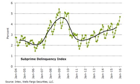Delinquencies on subprime auto loans packaged into bonds rose in January to 4.7 percent, a level not seen since 2010, according to data from Wells Fargo & Co.