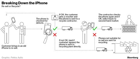 The process starts at hundreds of Apple stores globally, or online, where the company offers gift certificates to lure iPhone owners to sell back their devices.