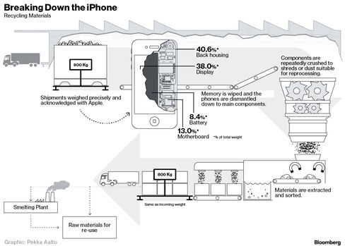 The plant is one of a handful around the world, chosen by Apple Inc. to grind up and recycle its iconic phones. And just as the companies that manufacture the handsets are subject to strict standards and secrecy, the same applies in reverse for their disassembly, right down to weighing the shreds, to make sure nothing is lost.