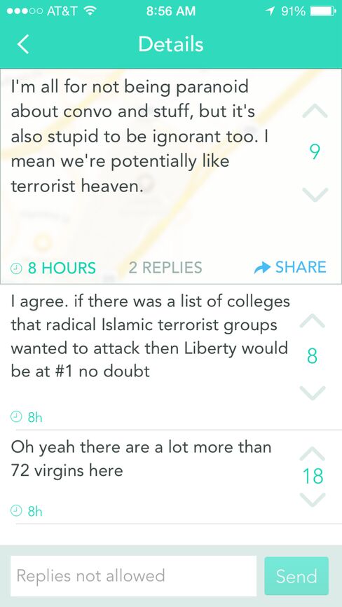 On Yik Yak, the anonymous gossip app, there was no such organizing. There was a persistent worry that terrorists could attack the college, which is roughly 150 miles from Washington, D.C. at the base of the Blue Ridge Mountains, as well as some jokes ("I'm here so I don't get fined") and meme-driven snark.