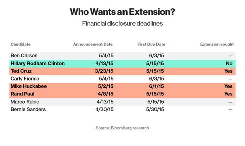 At least two 2016 presidential hopefuls—Rand Paul and Ted Cruz—who would otherwise have to file on Friday have already sought legally allowed extensions. Hillary Clinton plans to file by the end of Friday, but her campaign has not yet said whether it will make the document public before the government does. The Federal Election Commission has up until 30 days to process and release the paperwork.