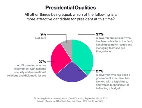 Thirty-seven percent of Americans say they're more drawn to a presidential candidate who is a government outsider but who has also been a leader, handled complex issues, and managed teams to get things done. Among Republicans and those who lean that way, the preference for outsider candidates is even more pronounced: 51 percent, compared to 24 percent among Democrats.