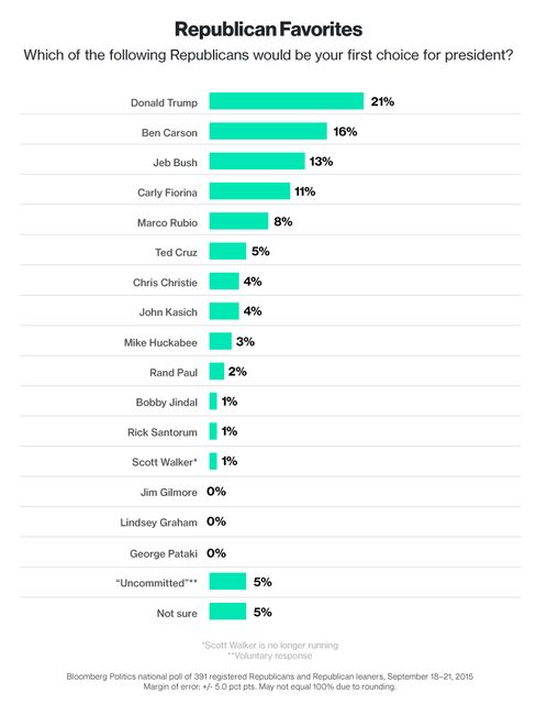 Three of the four candidates leading the Republican field fit that description: Trump, the first choice of 21 percent of registered Republicans and voters who say they lean that way, followed by neurosurgeon Ben Carson with 16 percent, former Florida Governor Jeb Bush with 13 percent, and former Hewlett-Packard CEO Carly Fiorina with 11 percent.