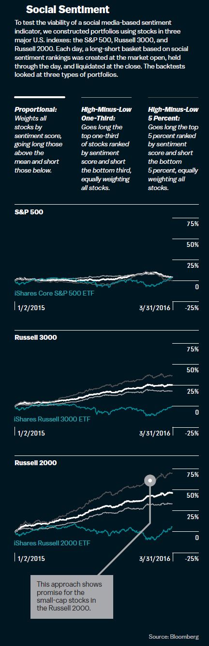 The first was a proportional portfolio. It weighted each stock in the index by the deviation of its sentiment score from the mean score. If above the mean, the portfolio would buy the stock; if below, it would short the shares.