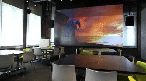 A Meyer Sound system combined with a display screen of sixteen 60″ monitors and a 10k projector? Very nice.