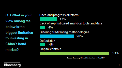 - Capital controls (53%) and credit rating methodologies (26%) are key barriers to investing in China’s bond markets;