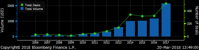 Following consultation and a survey with over 400 market participants across Asia, Bloomberg also unveiled today “Kungfu bond” as the industry reference for offshore U.S. dollar bonds issued by Chinese companies and financial institutions. China dollar bonds doubled in issuance to $214 billion in 2017, among which a record of $148 billion was issued by Chinese corporations, according to Bloomberg data. 80% of surveyed firms are already investing in the Chinese dollar bond market, and almost 30% expect the outlook of the market to overweight in 2018.