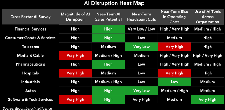 “The survey clearly demonstrates the deep concerns executives have about AI disruption and are less focused on headcount reduction,” said Anurag Rana, equity analyst for Technology at Bloomberg Intelligence. “This suggests that most industries are looking at AI technology as an opportunity to improve productivity rather than cut costs. The real winners will be those that can embed AI across the majority of their operations driving higher sales-per-employee, which will likely be the single most important metric by which successful companies will be measured.”