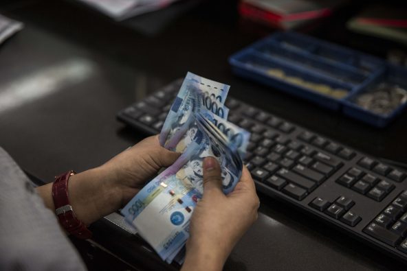 An employee counts Philippine Peso banknotes at a Manila Electric Co. (Meralco) store in Mandaluyong, Metro Manila, the Philippines on Thursday, May 5, 2016. Meralco said there is a pressing need to source additional capacity through bilateral power supply contracts in an emailed statement. Photographer: Taylor Weidman/Bloomberg