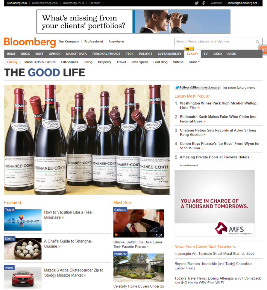 Connoisseurs of wine and fine dining will enjoy news and reviews from the experts on Bloomberg’s respected Muse team, who also supply material on art, auctions, books, theater, music, museums, and nightlife. Weekly reviews of high-end autos and cutting-edge consumer technology help readers decide where to spend their money wisely. Extensive travel coverage helps avoid tourism nightmares and plan the perfect getaway. And smart insights on property – including keyhole views into some of America’s most elegant mansions – help guide real estate investments.
