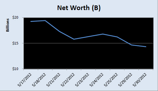 As Facebook continues to dominate the news, Mark Zuckerberg's position on the Bloomberg Billionaires Index has consistently fluctuated. He started out at #29 on the eve of the IPO with a net worth of $19.3 billion ahead of the Google founders and has since dropped off the ranking of the world's 40 wealthiest individuals with Facebook's falling stock price. Here's a look at how his wealth has fared over the 13 day period. To follow the daily ranking of the world's 40 richest, bookmark https://www.bloomberg.com/billionaires.
