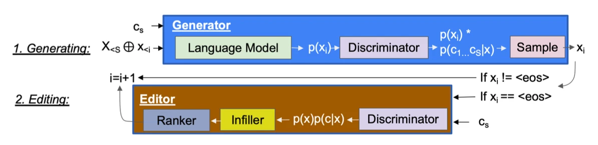 Our system combines two important approaches in text generation: generation and editing. During generation, we first perturb the output of a language model using a structurally-aware classifier and generate the next word by sampling from the perturbed distribution. Editing is performed at the end of each generated sentence: we identify the most “salient” words, which contribute the most to the discriminator’s prediction on the desired discourse class.