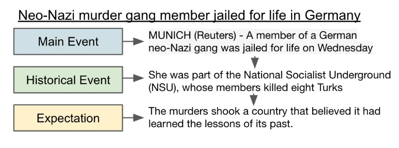Alex: In our work, we (1) develop baseline methods to solve this task and (2) further study how much structural awareness during story generation contributes to well-structured and fluent text. In our experiments, we use headlines as textual input to the language model and Van Dijk discourse tags (News as Discourse. Routledge. 2013.) as control codes, as illustrated in the Figure below, where “Main Event,” “Historical Event,” and “Expectation” are the control codes, conditioned on the title “Neo-Nazi murder gang member jailed for life in Germany.”
