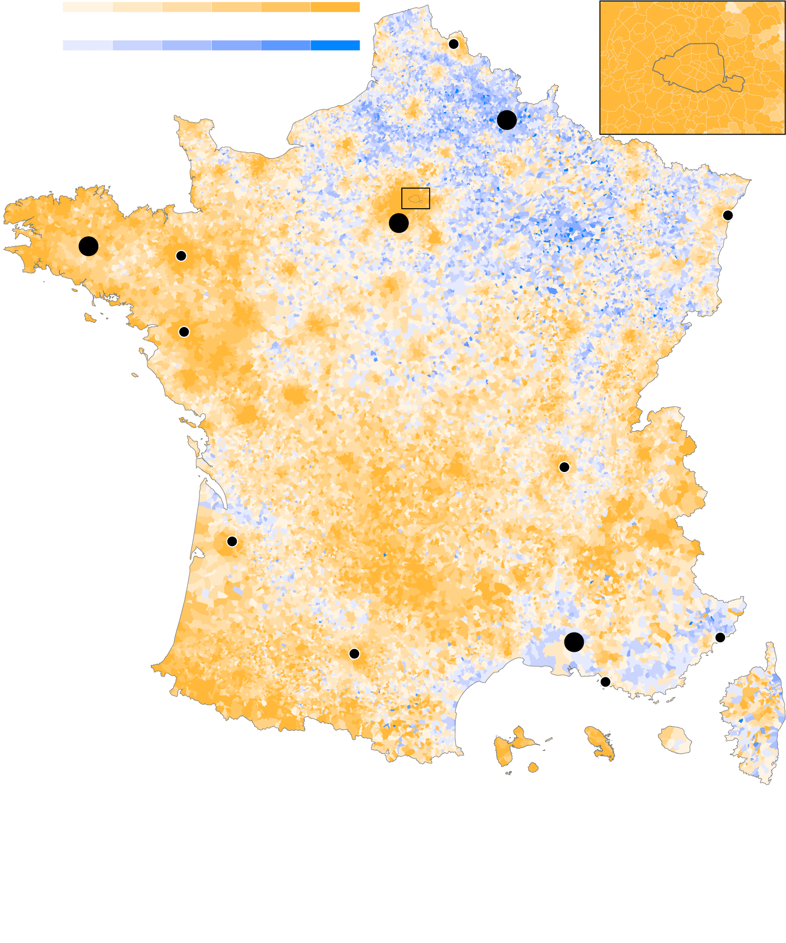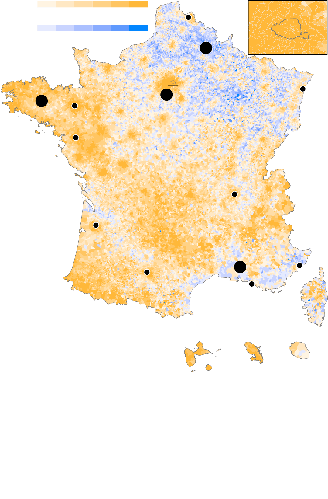 France’s major cities, with their highly educated and relatively well-off workforces, proved once again to be an insurmountable source of votes for Macron. Just in Paris proper he won by over 750,000 votes, while amassing a 367,000-vote margin in the Rhône department (home to Lyon) and a 141,000-vote edge in Bouches-du-Rhône, which includes Marseille and which went for Le Pen in the first round.