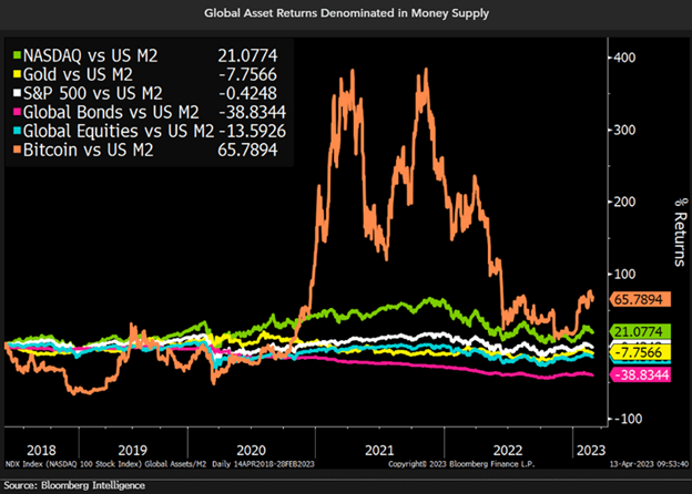 Al denominar los rendimientos en una medida representativa de la oferta de dinero, como M2/M3 o los balances de los bancos centrales, uno puede tener una idea real de si los activos tienen propiedades de reserva de valor a largo plazo frente a la devaluación. En el período relativamente corto desde 2018, Bitcoin y las acciones de tecnología de EE. UU. han sido los únicos activos que han servido como coberturas efectivas contra los enormes aumentos de la base monetaria.