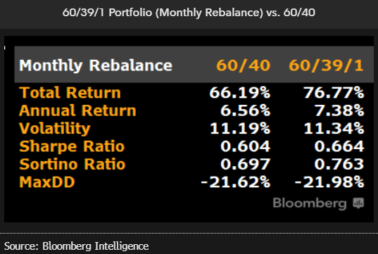 Podemos ver un escenario en los próximos años en el que Bitcoin comience a infiltrarse en los portafolios globales a expensas de los bonos. La historia demuestra que una pequeña asignación habría ayudado a un portafolio diversificado con todas las medidas de rendimiento y de rendimiento ajustado al riesgo.