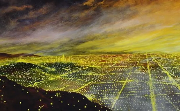 The prodigious expanse of the valley is painted in rich, dark colors, cut up at regular intervals by the bright orbs of yellow light organized into loose patterns of freeway networks. "For so many of us, this is our one image of L.A.—this vast landscape," says Martin Moeller, senior vice president and curator at the National Building Museum in Washington, D.C.