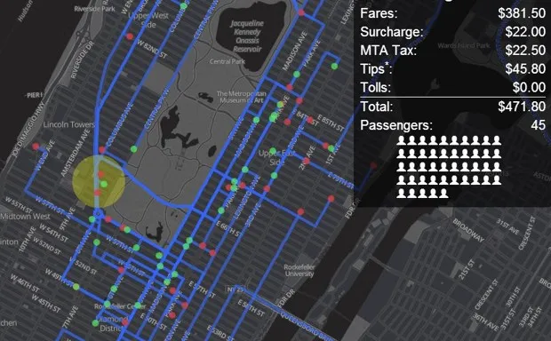 Chris Whong, a self-described "data junkie" from New York, has answered that question with a mesmerizing visualization, "NYC Taxis: A Day in the Life." He took a huge amount of ridership data for 2013—seriously, he had to give the city a new hard drive to obtain it—and then plotted a random sampling of 30 cabs' journeys over 24-hour periods. His model includes the number of passengers the taxis pick up as well as their daily earnings, which from the three I've viewed topped out at $491, $656, and $679. (Tips were not included unless paid by credit card.)