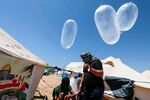 Masked protesters prepare to attach incendiary to inflated condoms filled with helium gas to be flown towards Israel at the Israel-Gaza border in al-Bureij.