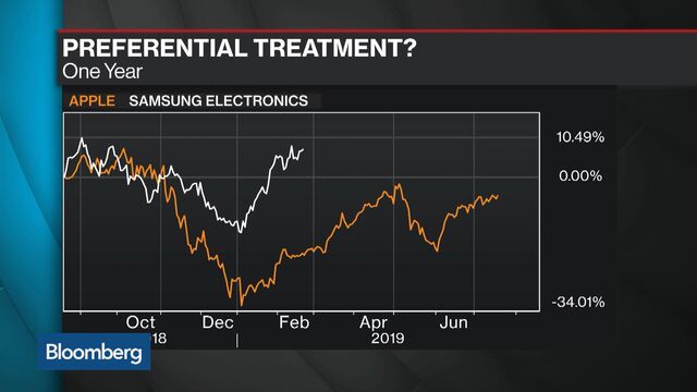 President Donald Trump said Apple Inc. Chief Executive Officer Tim Cook voiced concerns about chief competitor Samsung Electronics getting an edge because its products, unlike Apple’s, won’t be subject to tariffs when imported by the U.S.