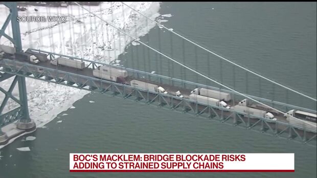 “We’ve already got a strained global supply chain, we don’t need this,” Governor Tiff Macklem said Wednesday when asked about truckers and other activists who have been halting traffic to the Windsor, Ontario span since Monday night. It serves as Canada’s main link to the U.S. auto industry, and the best alternative route for commercial traffic -- the Blue Water Bridge from Sarnia to Port Huron, Michigan -- has also been disrupted.