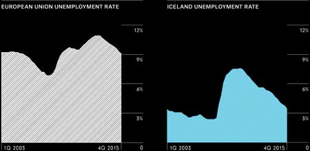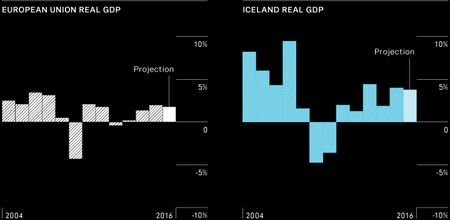 It’s a rebound other European nations would envy. Iceland’s gross domestic product is set to expand almost 4 percent this year, according to forecasts compiled by Bloomberg. The unemployment rate of 2.8 percent is about one-third the average of the European Union. As the state prepares to lift capital controls later this year, the banking sector continues to strengthen: State-owned Islandsbanki, the nation’s No. 2 lender with $8.4 billion in assets, boasts a common equity Tier 1 ratio of 28.3 percent. That’s more than twice the 12.7 percent average recorded by Europe’s 25 largest banks as of Dec. 31, according to Bloomberg data. “Before the crisis, the banks grew too fast and too much,” says Unnur Gunnarsdottir, director general of the Financial Supervisory Authority, which oversees the lenders. “That will not happen again.”