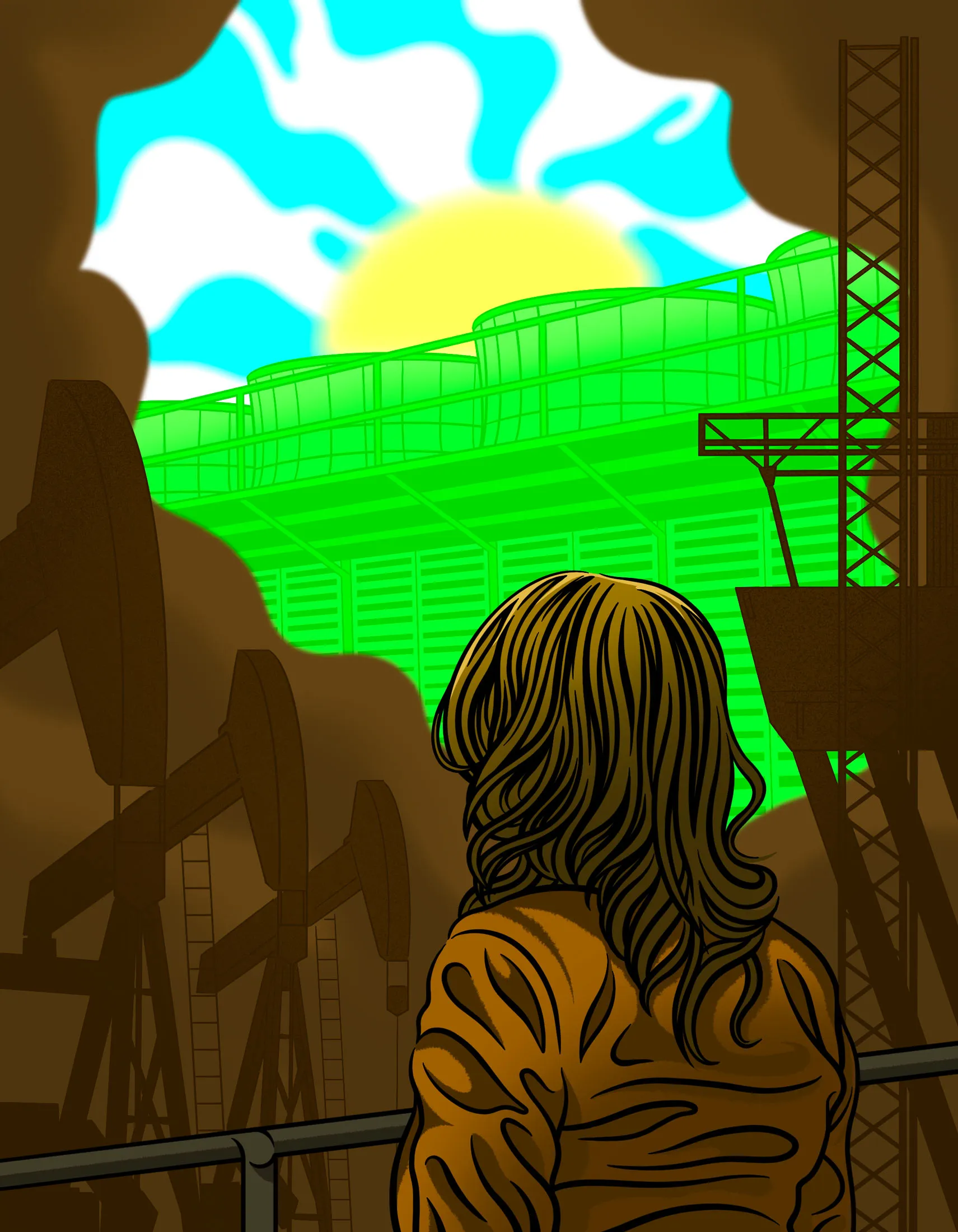 The prototype of the device meant to stave off climate devastation looks like a shipping container wrapped in vibrant green Venetian blinds. Fans atop this shell are designed to draw air into the device, where a honeycomblike structure full of proprietary chemicals extracts carbon dioxide from the air, removing an ever-so-slight bit of planet-warming gas from the atmosphere.