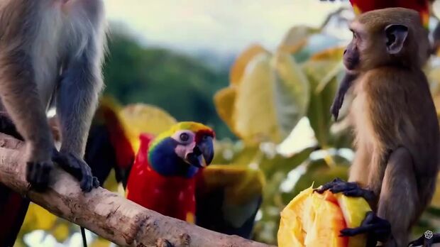 OpenAI’s Sora produces a short AI-generated video clip in response to the prompt: “An overhead view of a parrot flying through a verdant Costa Rica jungle, then landing on a tree branch to eat a piece of fruit with a group of monkeys. Golden hour, 35mm film.”