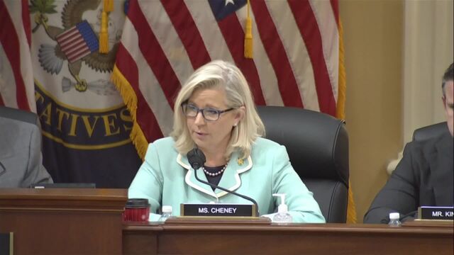US Representative Liz Cheney, a Wyoming Republican, says evidence will be presented that an “apparently” drunk Rudy Giuliani persuaded Trump to reject the advice of advisers to wait for outstanding votes to be counted in the 2020 presidential election and just declare victory based on the votes counted on Election Day. She speaks during the second day of the January 6 hearings on Capitol Hill. (Source: Bloomberg)