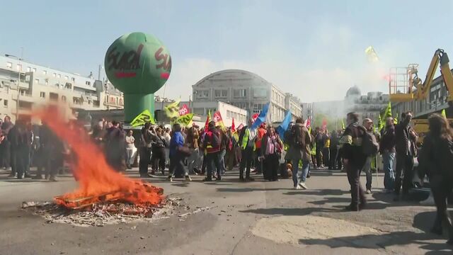 Protesters demonstrate against French President Emmanuel Macron’s proposed pension reforms in Paris.
