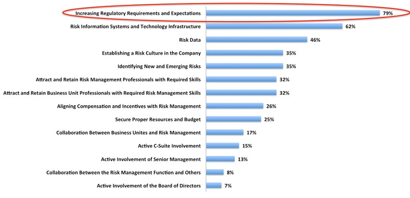 On average, the annual spending on compliance of regulations for banks and other financial institutions is estimated to be around 70 billion dollars. Unlike the incumbents, RegTech solutions are agile while those developed by traditional players are robust. A good data that shows that RegTech investments will continue to grow is that the increasing regulatory requirements and expectations is the most challenging topic for financial institutions globally when managing risks, as shown on the chart below: