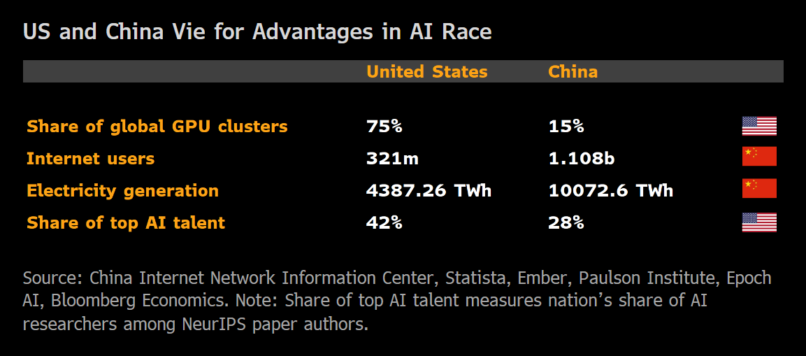 Computational power sets the pace of training, tuning and deploying AI. The US has a decisive edge for producing superior models.