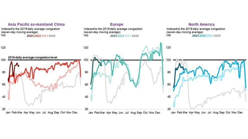 Global mobility faces headwinds, as key regions saw traffic levels weaken on a week-on-week basis and against the same week last year. Europe is the only tracked region to see traffic fall below the same week in 2022. Road congestion levels in China fell slightly following several weeks of strong growth, and currently stands above 2022-highs.