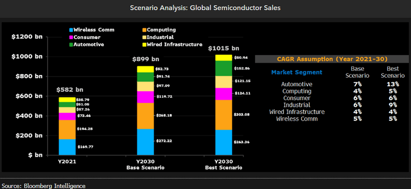 Semiconductor sales growth in the coming decade will be driven by new markets created by vehicle electrification, industrial automation and smart home applications, while sales for PCs and smartphones will likely stagnate as their markets mature. Our scenario analysis suggests that global semiconductor demand may grow to about $900 billion to $1.65 trillion in 2030, led by a 7-13% compound average growth rate for automotive chips and 6-9% for industrial chips.