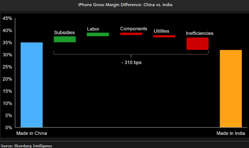 Apple’s iPhone production challenges in India could arise more from operating inefficiency rather than direct costs. As Apple shifts some production from China to less-developed India, its iPhones’ gross margin could shrink to 31.9% from around 35%, in our scenario. India’s government subsidies and lower labor costs could offer a nearly 400 basis-point gross margin tailwind, but extra costs for imported components, utilities, and operating inefficiency could kick up a 700 basis-point gross margin headwind. Lack of scale at the outset could deliver an even bigger blow.