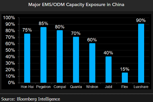 US-listed Jabil and Flex have notably lower exposures in China — 40% and 15%, respectively, of capacity in 2021 — due partially to the trade war impacts. For instance, Flex sold two factories in China as it ended its relationship with Huawei.