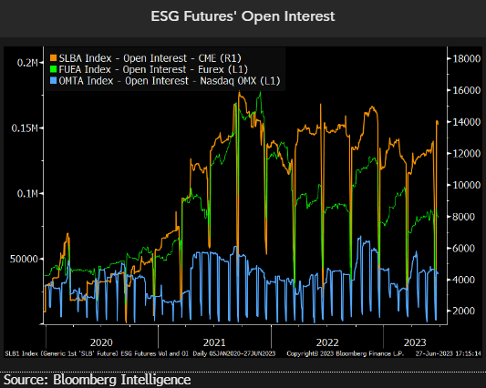 CME Group, Eurex (Deutsche Boerse), Nasdaq and Intercontinental Exchange are leading the innovation in ESG futures and options. Though the contracts are nascent and have yet to become meaningful contributors to exchanges’ volume and revenue, uptake in ESG-related assets and investor demand for derivatives offer a product-development opportunity. More recently, demand has flattened, with open interest challenged to expand since 2021. As liquidity grows amid a focus on several new contracts, early movers may have a competitive advantage. Regulation and industry standardization could accelerate the adoption of ESG derivatives.