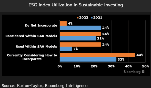 The report suggests that these products are gaining traction from asset owners, with nearly 60% of respondents saying ESG has become more important to their investment strategy, and only 4% not actively using or not considering using these products in their strategy, down from 24% in 2021.