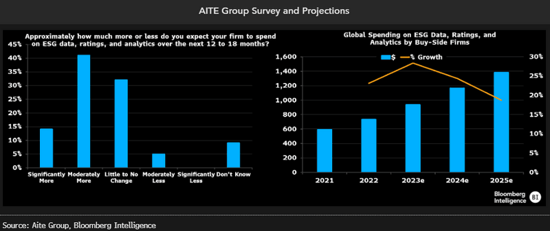 Aite Group’s projections suggest the ESG spending ramp-up may slow after this year, with 24% growth in 2024 and 19% in 2025. Still, this represents among the fastest-growing segments for providers.